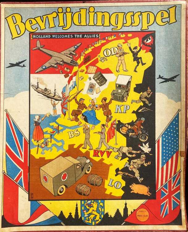 Bevrijdingsspel ("Liberation Game") appears to be a relatively scarce WWII Dutch game celebrating the liberation of the Netherlands by the Allies from Nazi Germany. The game consists of a colorful Gameboard with central images of a liberated Netherlands with local Dutch people celebrating with Allied troops, relief convoys of ships, ambulances and food...