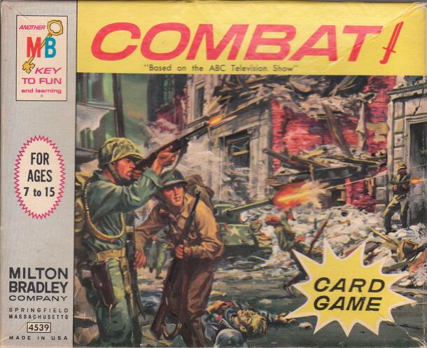From the rules: COMBAT, the new war card game, is inspired by the popular TV show. Players mix both skill and strategy with risk and luck to "capture" as many weapons as they are able. In the pack of 40 cards are 32 weapon card...which show a NUMBER, INSIGNIA and a WEAPON. The NUMBER on the WEAPON card is the point VALUE of the card in scoring. The...