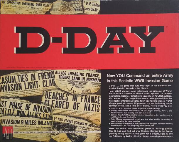D-DAY was completely revised in 1977 to incorporate the latest simulation design innovations including Strategic Movement, Air Interdiction, and Tactical Airpower. It is an Intermediate 1 level game on the The Avalon Hill Game Co Complexity Scale for 2 players aged 12 & up with a varying playing time of 1-4 hours. D-DAY belongs to the The Avalon Hill Game...
