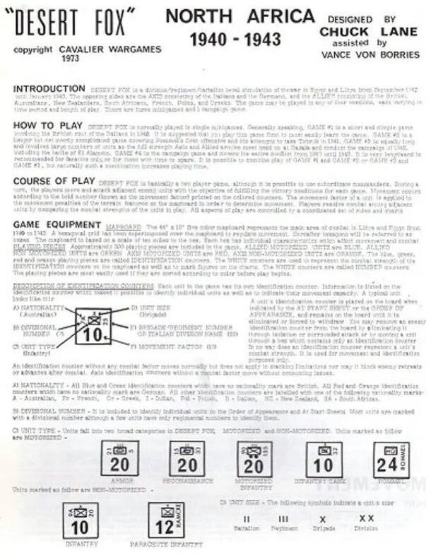 Desert Fox is a brigade level simulation of the war in North Africa from the arrival of Erwin Rommel in March of 1941 until the end of 1942 when the Allies, landing amphibious forces in Western Africa, blockaded any chances for future Axis offensives in North Africa. The Axis player attempts to secure Libya and Egypt by seizing Alexandria, while the...
