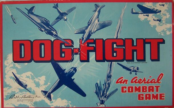 From the rules: "Dog Fight very closely approaches an actual combat between fighting planes, bombers and anti-aircraft guns. The play takes place on a vertical board which allows the important consideration of altitude to become a part of the play. The planes against the sunset sky make a most realistic picture. "By making use of the allowable moves of the...