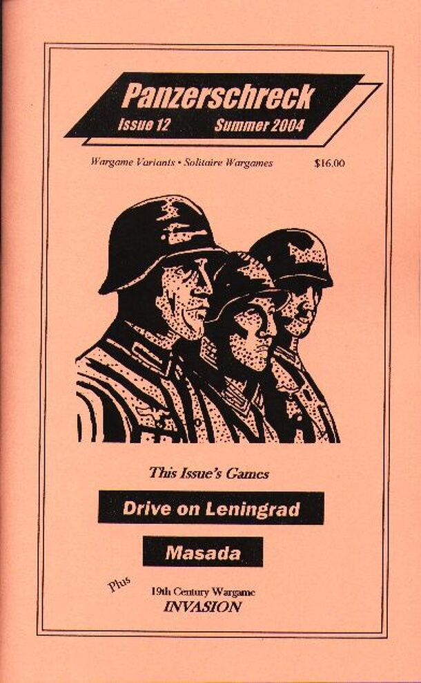 Panzerschreck Magazine #12. This game covers the German Army Group North's drive on Leningrad in 1941, with corps and army-level counters and one week per turn. This issue also contains two "mini" games, Masada (covering the Roman siege of 72-73) and "Invasion" (a reprint of a 19th century game on a possible invasion of England). As with all Panzerschreck...