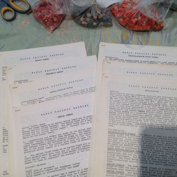 Early Pacific Battles is an Operational/Tactical level, World War II board-wargame set in the Pacific Theater of Operations. This wargame kit, self-published by Bruce Moore in 1972, covers all aspects of 1942 battles in the Pacific. Air to Air, Air to Surface (fixed installations and naval task forces), Naval Surface and Land Combat are all treated as well...