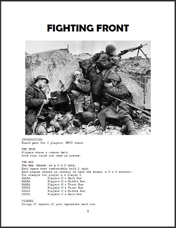A World War II themed game played using cards placed on a 5x6 grid. The players portray one of five nationalities: German, Russian, American, or Japanese. At the start of the game, each player controls one half of the board. The cards in the deck represent combat units, leaders, locations, and events. The types of combat units represented in the game...