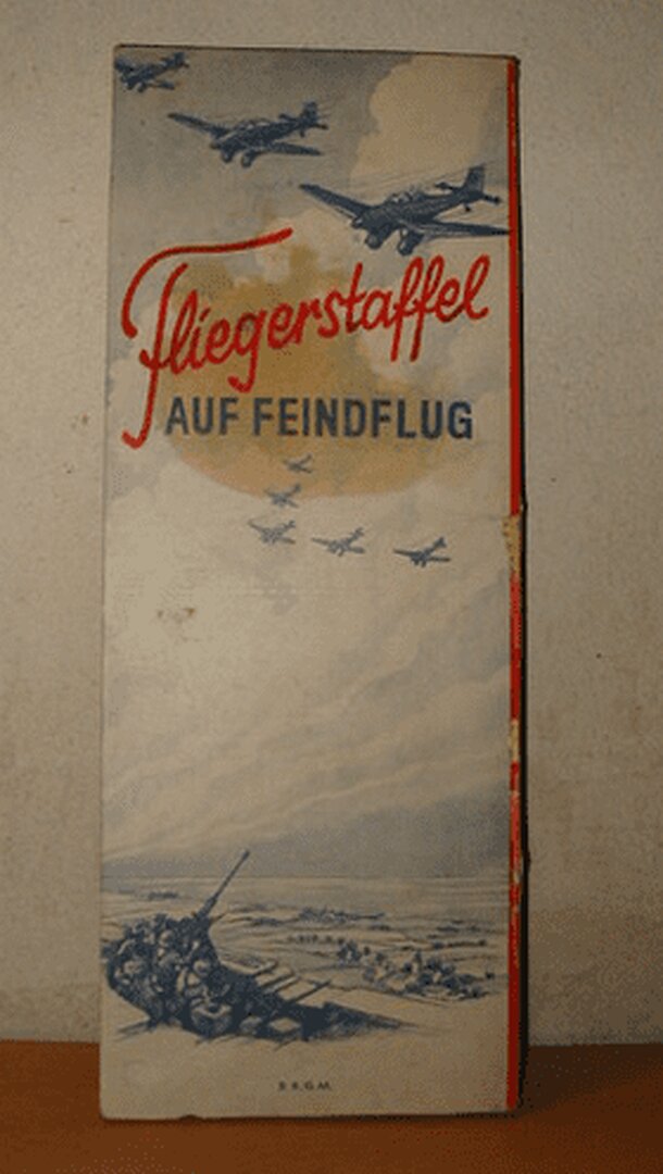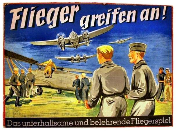 Objective: be the first reaching target zone with all your meeples (planes) - moving by turns - each player rolls the die moving forward; if die shows a '4' a new plane (totally 4) must be taken out of supply; if move ends on a space with an own plane: not allowed; if move ends upon a space with an opponent's plane: remove opponent's plane back to start;...