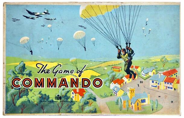 A simple version of the classic fox & geese type of strategy game using counters. Creatively set in a world war two theme using commando parachutists attacking an enemy camp. Made by Chad Valley and looks to be early 1940s. The game is to see whether the three commandos (yellow counters) can defeat and outwit the 15 defenders (blue counters) by moving...