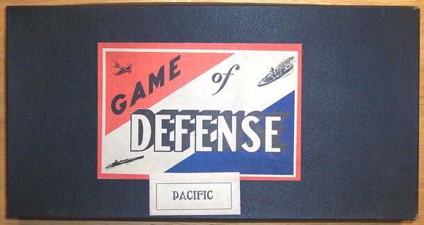 Game of Defense: Pacific is a light wargame. It is for two sides (U.S. and "Asiatic"), each of whom has five ships each of three types (battleships, cruisers, and submarines). The ships are deployed on a map of the Pacific with a grid divided into red and white squares. On a turn a player moves one piece (or possibly more than one, as the rules are a bit...