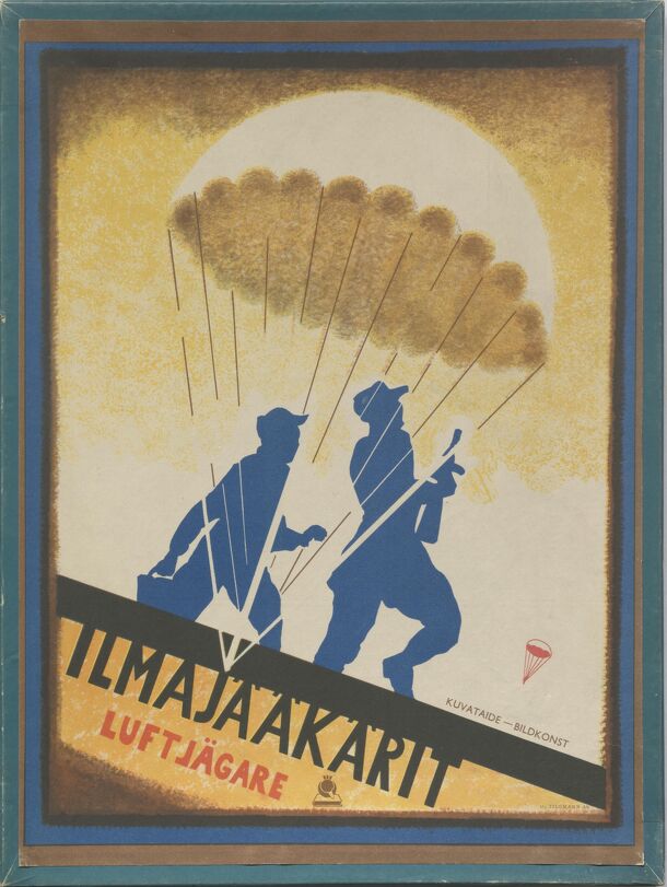 War-themed abstract game published during the Second World War, where one player controls 8 paratroopers that are randomly placed in the center of the board by rolling dice, then try to move to place demolition charges in marked locations in each corner of the board. In each corner begins 4 defending guards, mechanics, pilots, or gunners, for a total of 16...