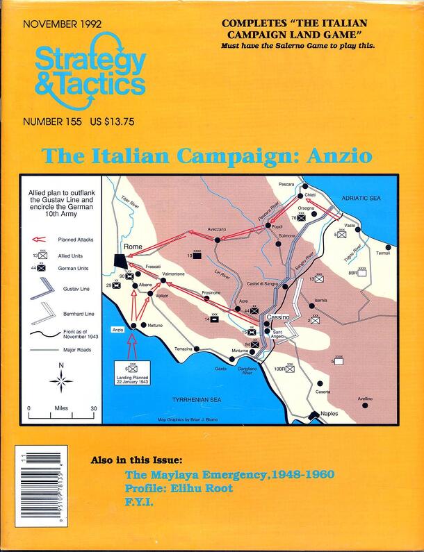 The Italian Campaign Series: Anzio, is the third of four operational level games (Sicily, Salerno, Anzio and Med War) simulating the Battle for Italy in World War II using the Westwar Gaming System developed by Vanguard Games. This game completes 'The Italian Campaign' series land game and cannot be played by itself... ownership of Salerno is required. The...