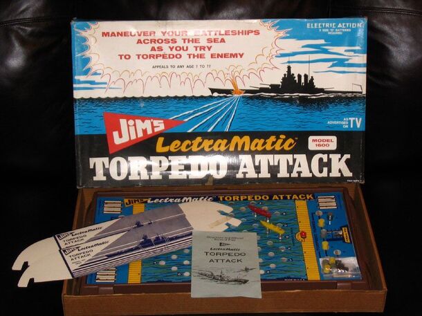 Maybe the first battery operated game ever produced. Torpedo attack relies upon two "D" sized batteries to power the naval warfare game board. Two opponents maneuver their battleships across the ocean while the opposing player attempts to find and torpedo them. A red light comes on when a hit is successful and a small magnet is placed upon the "damaged"...