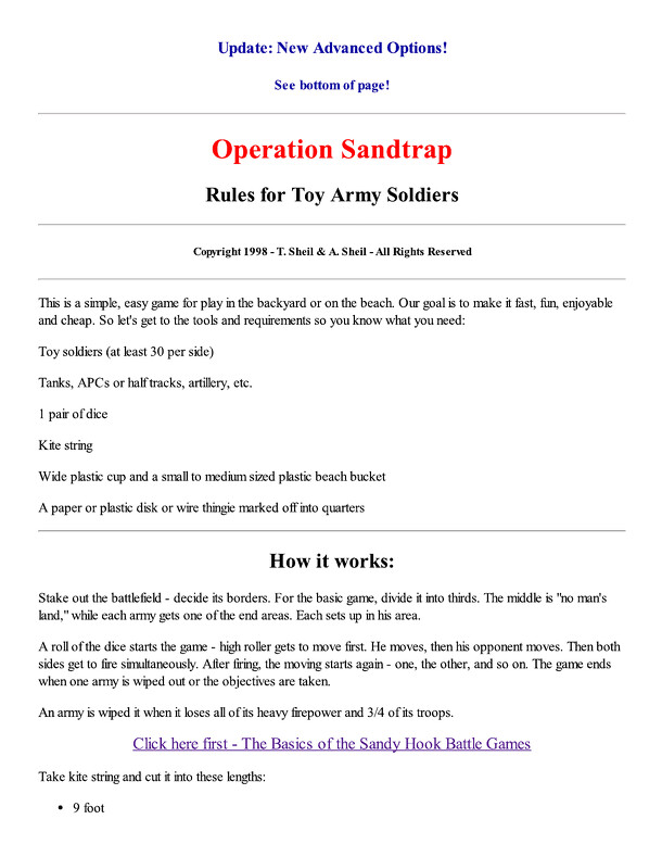 Rules for Toy Army Soldiers. This is a simple, easy game for play in the backyard or on the beach. Our goal is to make it fast, fun, enjoyable and cheap. The players must supply at least thirty toy soldiers per side and any heavy weapons or vehicles (tanks, APCs, half tracks, artillery, etc.) Each type of weapon (rifles, mortars, grenades, flamethrowers...