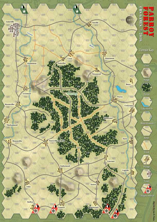 This game covers the US 79th Infantry Divisions attempts to clear the Parroy Forest in France during late September, early October 1944. They were primarily facing the German 15th Pz Grenadier Division. Units are a mix of battalions and companies/squadron's. One hex equals 1 kilometre. The system is a derivative of the Road to St Die system and uses a...