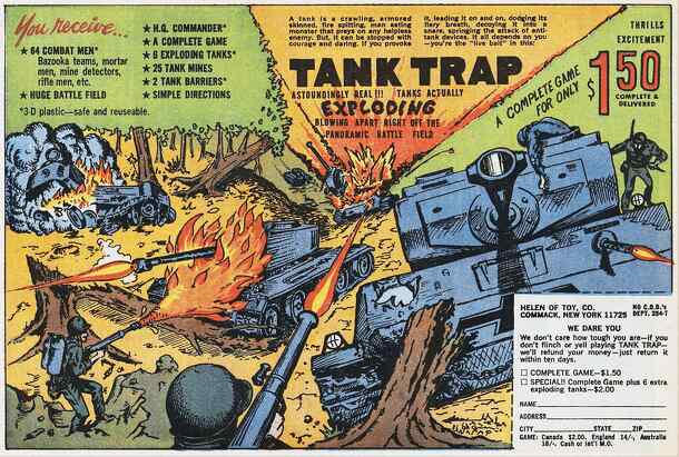 One of 9 games released by the Helen of Toy Game Company that graced many a comic book from the late 50's into the early 80's. Tank Trap was a classic Helen of Toy War Game that featured 3D G.I. Toy Soldiers by GIANT, a large "Battlefield" Playmat, and among other accessories, the infamous "Exploding Tanks." The game had 64 COMBAT MEN and 6 TANKS (3 olive...