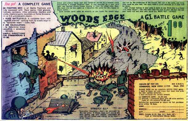 One of 9 games released by Helen of Toy that graced many a comic book from the late 50's into the early 80's. Each game was usually shipped in a non-descript cardboard box. The Woods Edge G.I. Battle Game from Helen of Toy featured 88 3D G.I. figures by GIANT (evidently in two colors - Green/Olive & Gray), a Playmat, "2 Die Calculators" which were...