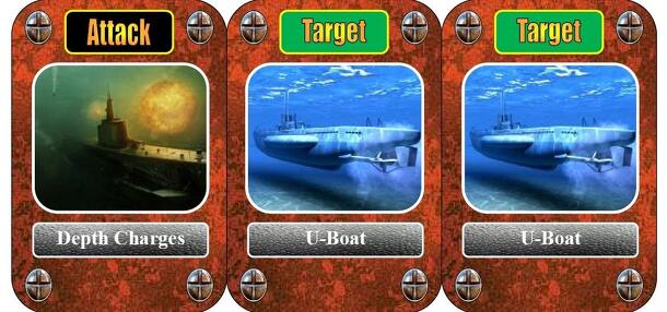 "Card game. Deck of 90 cards. Simulation of U-boat attacks vs allied shipping during WWII. One player is the wolf pack, the other is the allied convoy." The custom deck includes six types of cards: Target, Detection, Attack, Evasion, Water, and Discard. The Wolf Pack player wins if six Transports are destroyed. The Convoy player wins if four U-Boats are...