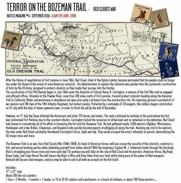 The Bozeman Trail is an epic from Red Cloud's War (1866-1868). As head of American forces, will you assure the security of the colonists, construct a fort, and escort working parties while defending yourself from Indian attack? Will the impetuous Captain W.J. Fetterman break-through the blockade that is strangling your forces more and more each day? Or...
