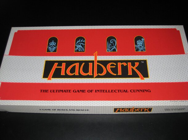 Hauberk: The Ultimate Game of Intellectual Cunning, is how this game is billed. The side of the box reads "A game of ruses and rescue." And according to the rule book, the objective is: To rescue the Princess by entering the castle where she is located after you have become a Player Knight. Though you are courageous as a Squire, and possess the ability to...