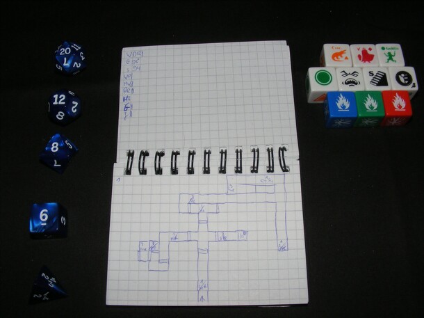 I-Magi-Nation is a dungeon crawler that got created during the "my many monster dice game competition" held by Todd Sanders in August 2010. The task was, to create a game that uses mainly a couple of dice, that were permitted by Todd. Some of those dice are common, some are special dice, available from Flying Buffalo Inc The required common dice are: 1d4...