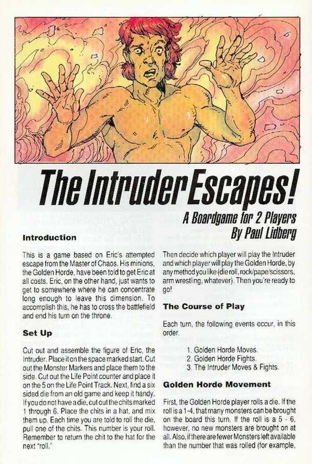 The Intruder Escapes is a quick two-player game that was published in Intruder magazine #2. One player takes the role of Eric, the Intruder, and the other player plays the monstrous Golden Hoarde. The object for the Intruder player is to cross the map and enter the throne room, thus avoiding the Master of Chaos and winning the game. For the Golden Hoarde...