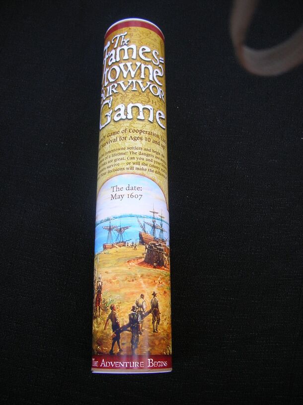 "The Family game of Cooperation and Survival" is a historical game based on the founding of Jamestown. "Developed in cooperation with the Association for the Preservation of Virginia Antiquities (APVA) and the Jamestown-Yorktown Foundation, this game has players taking the role of English colonists, eager to succeed in the New World." The date is May 1607....
