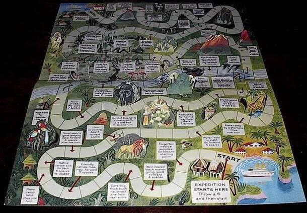 Promotional game published by J S Fry & Sons, a leading manufacturer of chocolate at this time (most famous for the TV adverts for "Fry's Turkish Delight). A basic roll and move game. The board track covers the Expedition Start and ends at the expedition end, where a boat awaits your arrival. Obey instructions if you land on special squares. First to...