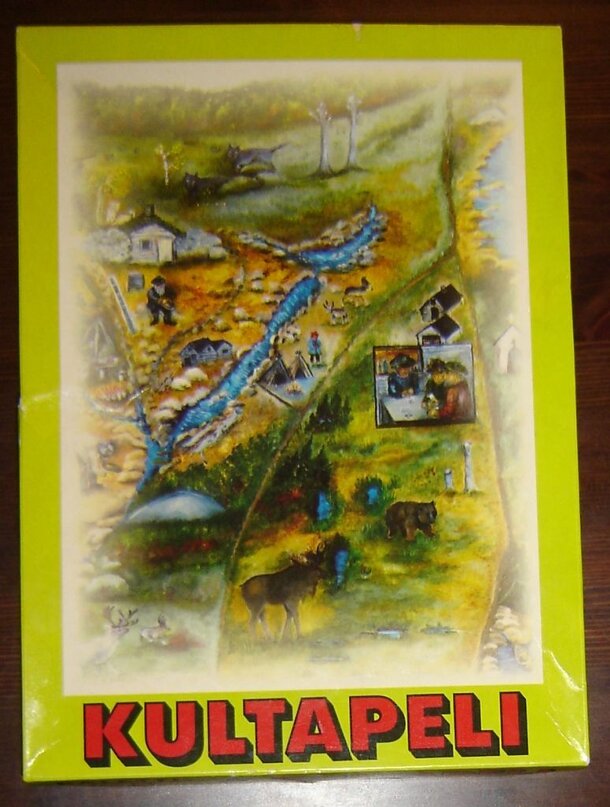 In Kultapeli ("The Gold Game"), 2-6 players represent prospectors in the Finnish Lapland in 1949. The idea of the game is to first make one to three claims, register them at the Bank/Registry Office, then pan for some nuggets of gold and sell them - and any claims that have not run dry yet - to the bank, to reach a sum agreed before the start of the game...