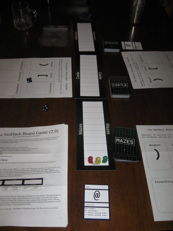 Based on the most famous and popular Roguelike video game, NetHack, this two player board game adaptation is divided into three boards representing three different areas from the video game: the Mazes of Menace, the Castle and Gehennom. Each player's token moves along a fixed path and draws an encounter card on each space from the deck corresponding to the...
