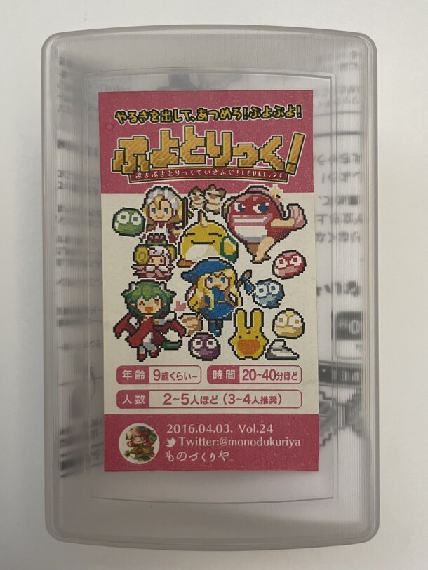 This trick taking game is based on the ぶよぶよ and び魔導物語 series, computer RPG games. During each trick, players play battle card to win a monster card. Each card has strength of all 4 characters. For each trick, a monster is revealed. The lead trick choose which character is the dominant character of the current trick. After every player played a card, the...
