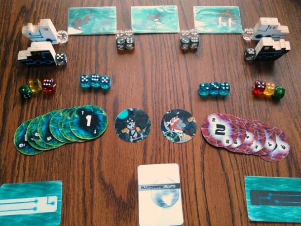 The zepuin on your shoulder flaps nervously as the giant tusks of a palgus wroth surface in the distance. It doesn't seem pleased with all the exchange of cannon fire. Neptune rises on the iceberg riddled coast. Someone put your loot on that ship, and the time to retaliate is running thin! Overview: Plundering Pluto is a dexterity, dice and deduction game...