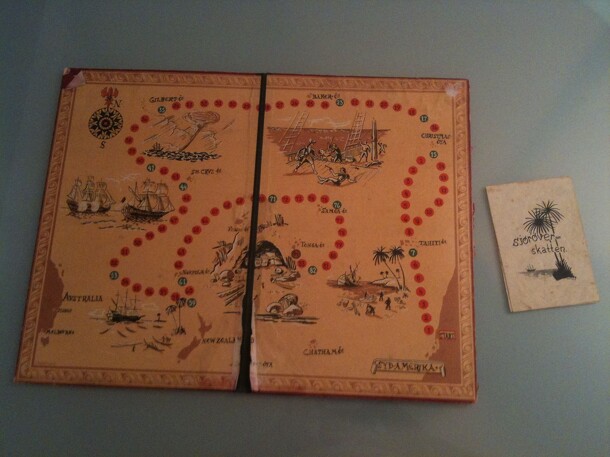 vintage roll dice and move game from 1941; Players start at the coast of South America and "sails" west. The target is being the first to Sail to the Tonga Isles in one piece and find the great Pirate treasure, all the while avoiding bad weather, pirates, coral reefs and other dangers along the way. There is only one rather swirly route that takes you...