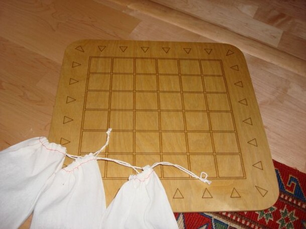 A game similar to (but not identical to) Ludo, where the players race to be first to the treasure in the middle of the board. 2-4 players can play, taking turns. Each have three pieces, moving by rolls of a die along interconnected paths that lead to the treasure. The paths are organized in three distinctive levels with paths between them. The players can...