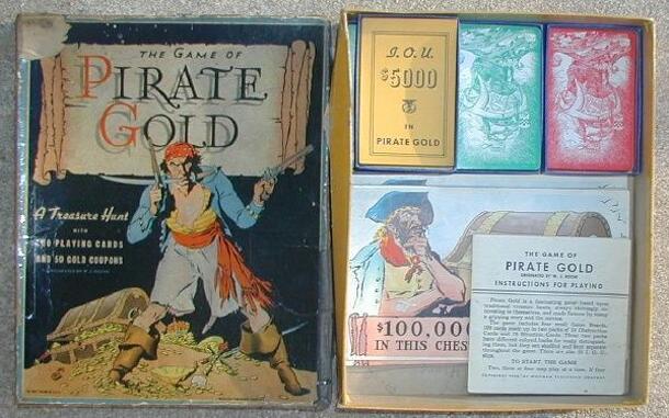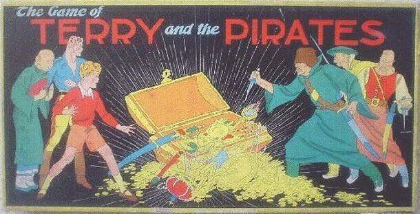The Game of Terry and the Pirates was produced by the Whitman Co. in 1937. Special dice let Terry, Pat, Connie, Dale, Old Pops and the Bandits to try and move around the board in an attempt to collect the treasures. Playing pieces included 4 wooden markers for the characters and 4 wooden scoring markers. The playing board had different things that could...