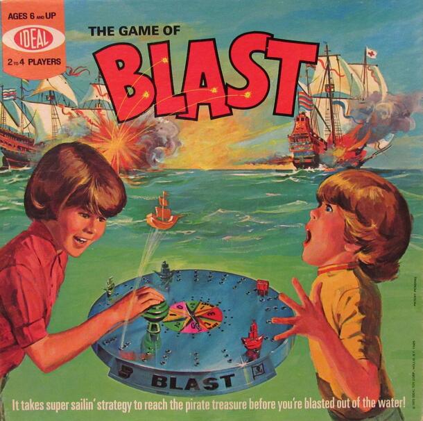 From the box: "It takes super sailin' to reach the pirate treasure before you're blasted out of the water!" Players spin the cutlass and move their ships round the board on their way to the treasure chest. If the spinning cutlass lands on 'Blast', the spinning player gets to attempt to 'blast' an opponent's ship by placing an air pump into one of the two...