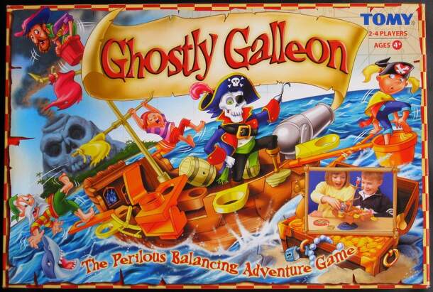 Ghostly Galleon is a simple childrens roll-and-move (spin-and-move?) game with an added element of dexterity. The game consists of a plastic pirate ship on a tilted rotating base, a spinner, four shipmates (the player pieces), and a heavyweight Ghost Pirate. The ship contains a quantity of beads which shift around like an unstable cargo, and there are...
