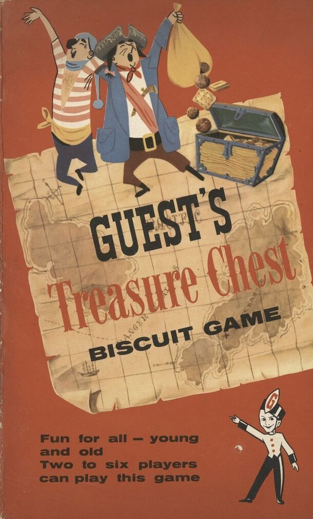 A snakes-and-ladders like game, using palm trees as snakes and packets of Guest's biscuits as ladders, to promote the products of the publisher's Melbourne-based biscuit factory. A metal spinner is built into the board. Counters were provided at the side of the board ready to be cut out, and were differentiated by colour and the name of one of Guest's...