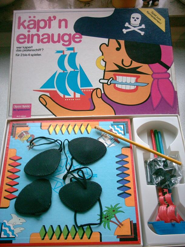 The players are pirates and wear patches over one eye. Then they try to pick up a ship on the game board (simultaneously), using a kind of fishing rod with a hook, which is difficult, as they have impaired vision. Each time a player can pick up the ship, he or she gets a ship token. There is a fine of one ship token for knocking over the ship. The first...