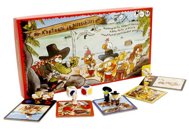 Based on the books of beloved Finnish childrens author Mauri Kunnas, Kapteeni ja pilssihiiri ("Captain and the bilge rat") is a roll and move game where players try to get their three pawns to complete a circuit around the board. Movement is color-coded: red symbol on a die means the red pawn moves to the next red tile, blue moves blue and so on. There are...