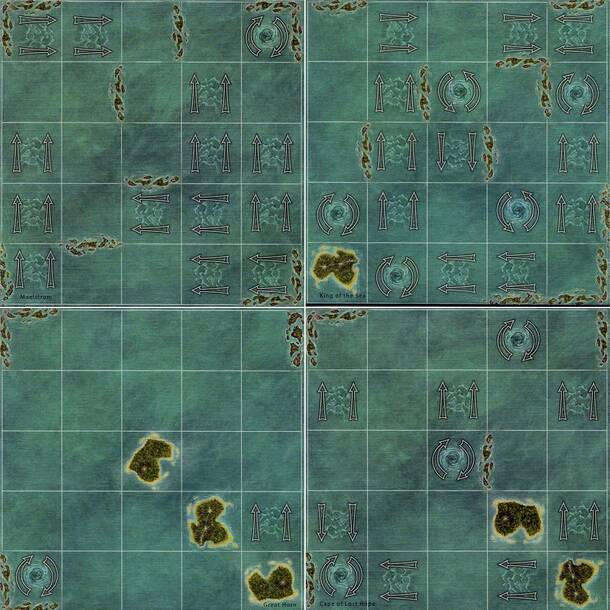This expansion adds 2 double-sided maps to expand your sailing horizons, as well as rules for a fifth player (included on the reverse side of the Rough Waters rules). Great Horn: A long hook that bottlenecks navigation -- especially around map layouts with corners. Cape of Lost Hope: A more difficult version of Great Horn that removes a center island, but...