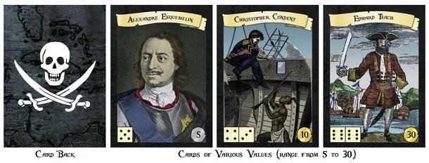 Each player controls a pirate Expedition consisting of a captain, ship, and crew. An Expedition is rated for a number of characteristics: Crew, Cannon, Navigation, Discipline, Sailing, and Swashbuckling. Hazards that may be faced by the Expeditions include Spanish Galleons, Typhoons, Volcanic Eruptions, and Hostile Natives. The winner is the player who...