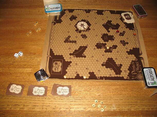 Players enlist a pirate crew trying to get the most valuable loot at the end of the game. Pirate Rush is a role selection game for 2-4 players of about 45 minutes long. 34 treasure tiles are arranged in eight piles (the isles). Each turn the players will select a role (wich give them different powers for the turn), get information about treasures in the...