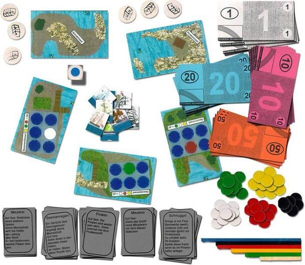 Each player owns a ship with money and goods on it. On your turn roll the die which will show what tile to take. This tile represents the distance you are allowed to move. If you roll the color black, you become the owner of the pirate ship for this turn. If you reach another ship owned by another pirate you take half of the other pirates money. Player...