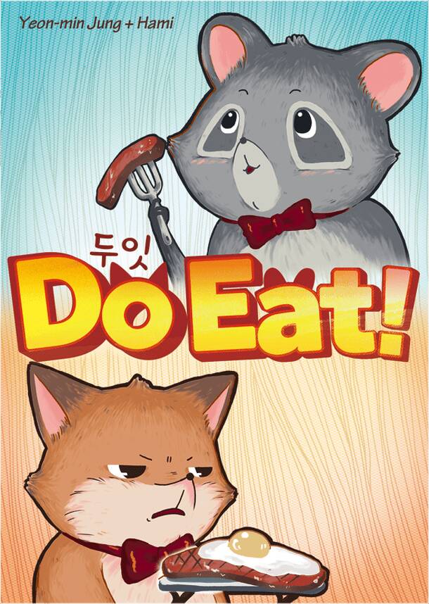 Do Eat! is simple card game for 2 persons. Each player takes 5 cards and play three time. Each player choose one card and play back side. Open that cards and use action on that cards. next each player choose 2 cards and play and use last 2 cards. The game is set when 1 player has three token. New foods are ready today. When I ate the food, my strength is...