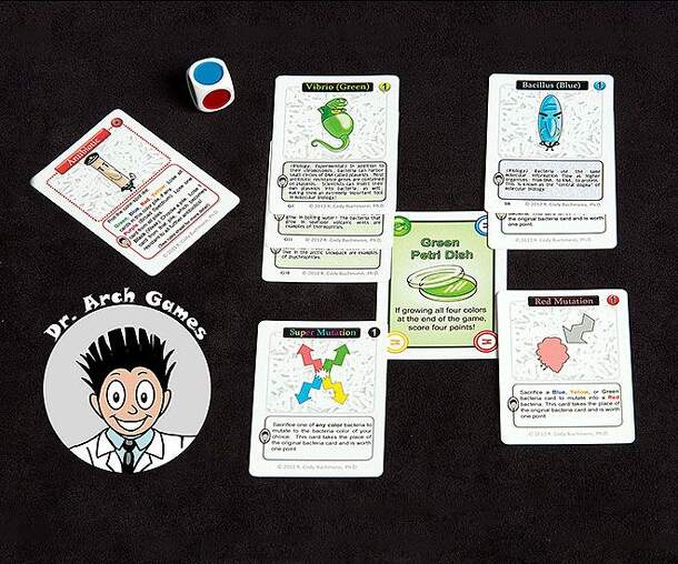 Each player begins with a card that represents one of four strains of bacteria. Each player maintains a hand of five cards that can include mutation cards that will permit the player to grow other players' strains in addition to his own. Other cards are random events, antibiotics (used to interfere with other players' cultures), and bacteria (used to help...