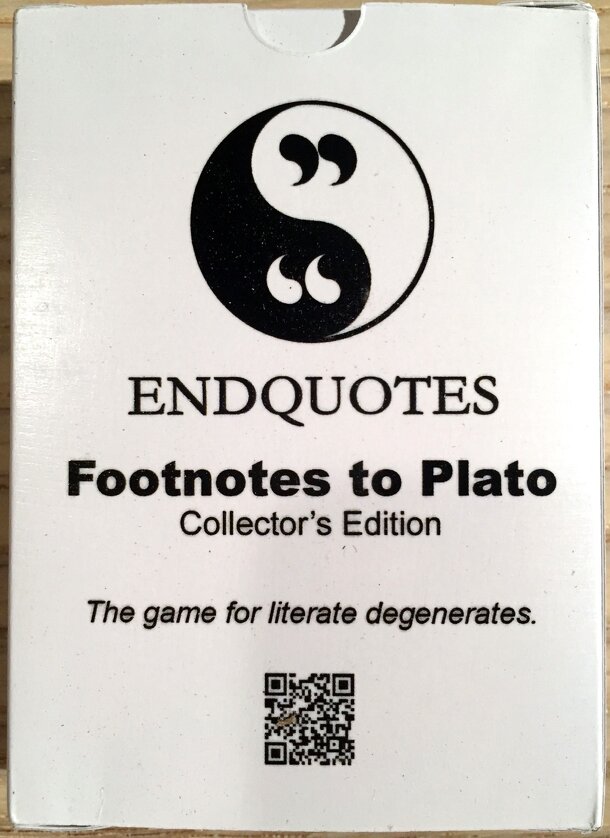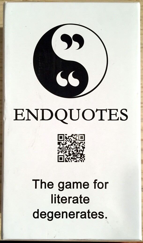 A party game for literate degenerates. Mash up epic quotes! EndQuotes lets you mash up hundreds of unforgettable lines from movies, tv, songs, books, and more! It consists of two decks of cards: one with quotes with their endings missing, and one with those endings. Each round, the active player draws a quote card, then the other players each secretly...