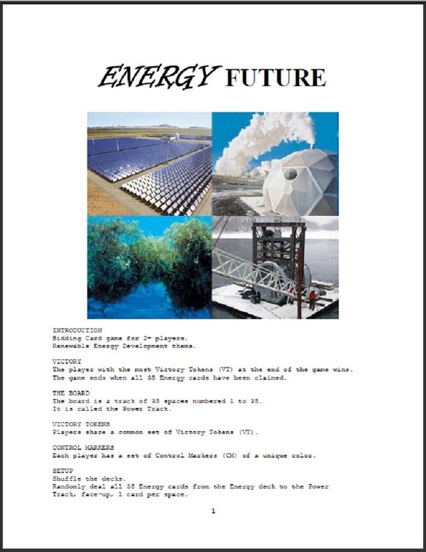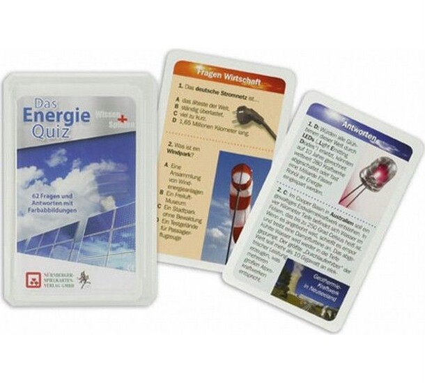Promotional trick card game. The cards show a specific energy and its advantages. All 36 cards are dealt. Jokers are to be placed at the end of your pile. One player starts with his first card and calls one of its marked advantages. Other players may choose one of their cards and should (must?) follow suit (= advantage). (This rule is not clear.) The...