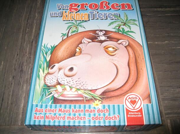 The animals get along well together. Sometimes they talk about who is the bigger animal. In this game before the turn player opens up the next card he has to foresee or to guess: "Is the next open animal bigger or smaller than the animal that is already open on the table?" For a right guess you get chips. The player who has filled his chip board totally...