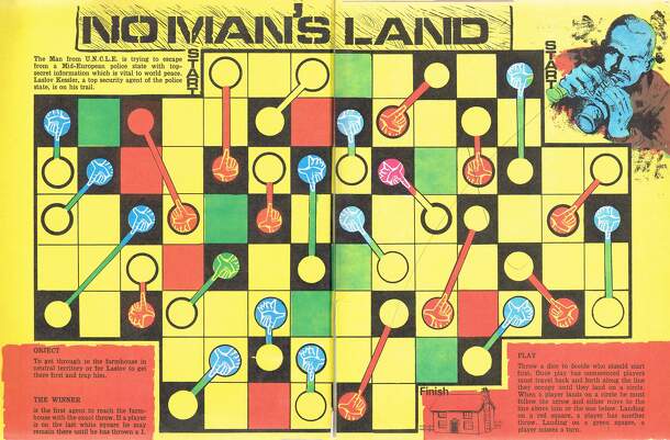 The game pits two players in a race to reach the 'safe' farmhouse. Each player rolls a die and moves along his line. You go back and forth until you land on a circle. The circles might send you up a line or down a line. If you land on a red square entitles you to another throw. Land on a green square and you miss a turn. The game appeared in The Man from...