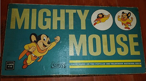 This is a simple track game based on the Mighty Mouse comics. On your turn you roll the die and advance the number of spaces indicated. If your roll would land you on an opponent's pawn, you move backwards instead. If you land on a hazard space, you are stuck, and must spend your next turn(s) moving the Mighty Mouse piece to your space. When Mighty Mouse...