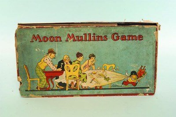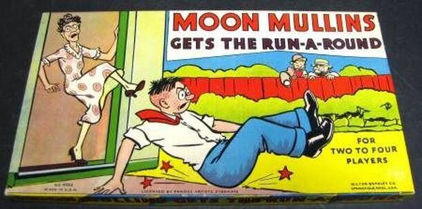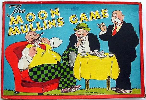 The MOON MULLINS Game based on the comic strip of the same name. The comedic things that happen in the cartoon strip happen in this game from "Bumping in to a Fat Lady" which causes you to move back 2 spaces to "Tripping over Carpets" which results in your being able to advance 3 spaces. This is a simple roll and move game from the late 1930's. Components...
