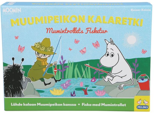 Moomintroll goes fishing. Players spread fish tiles on board face down and then take turns placing the Moomintroll figure on top of the tiles. If there's a fish, the tile is magnetic and will get stuck to the Moomintroll figure base. If the tile doesn't have fish, it won't catch. There are also Snufkin tiles that give you extra turns and Stinky tiles that...